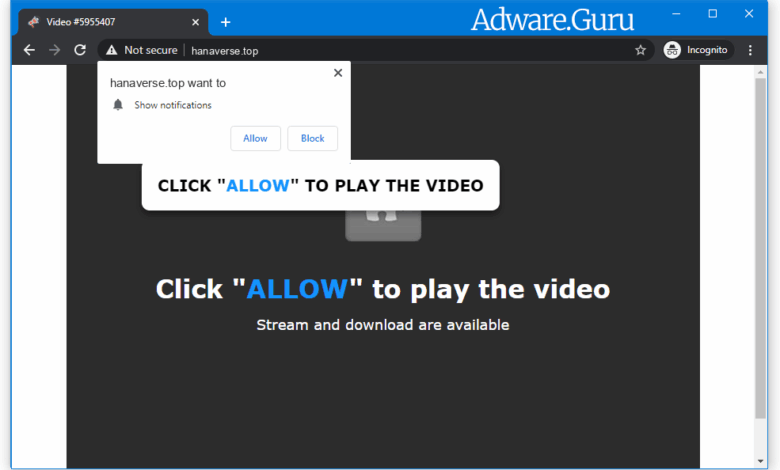 Hanaverse.top is a malicious site that displays fake messages to trick you into subscribing to its browser notifications. These are a few of the fake error alerts that the Hanaverse.top site will display to trick you into clicking the “Allow” button:
